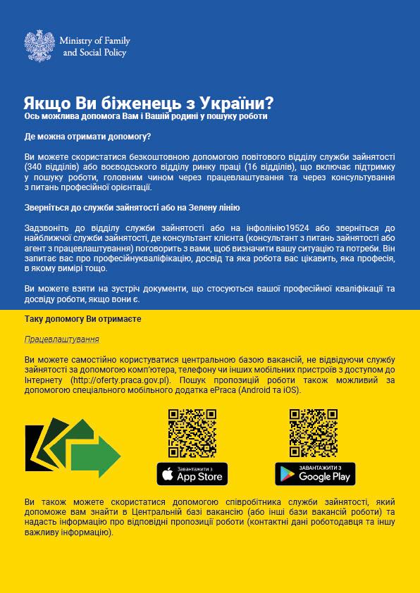 Przedstawiamy pakiet informacji dot. pomocy ze strony Publicznych Służb Zatrudnienia w znalezieniu pracy dla obywateli Ukrainy opracowany przez Ministerstwo Rodziny i Polityki Społecznej.